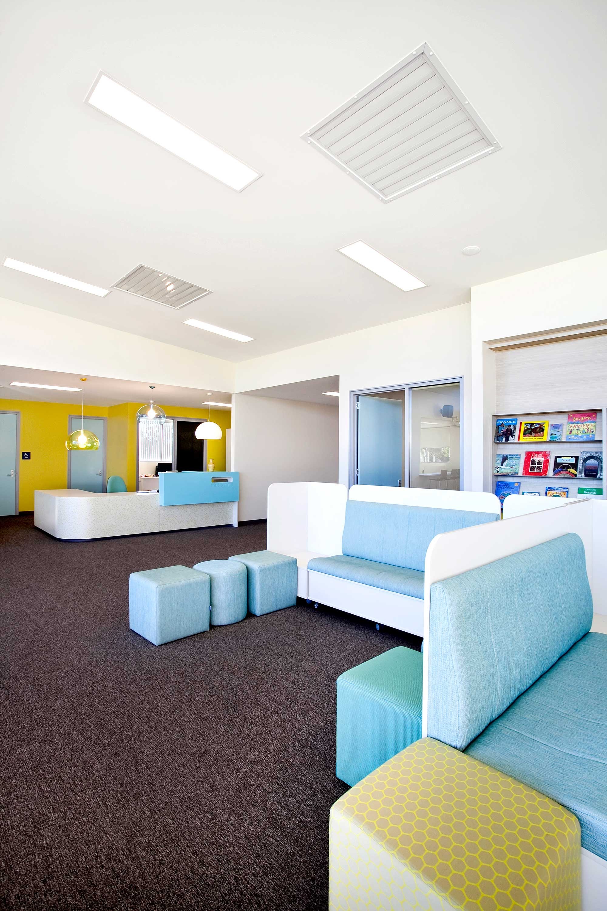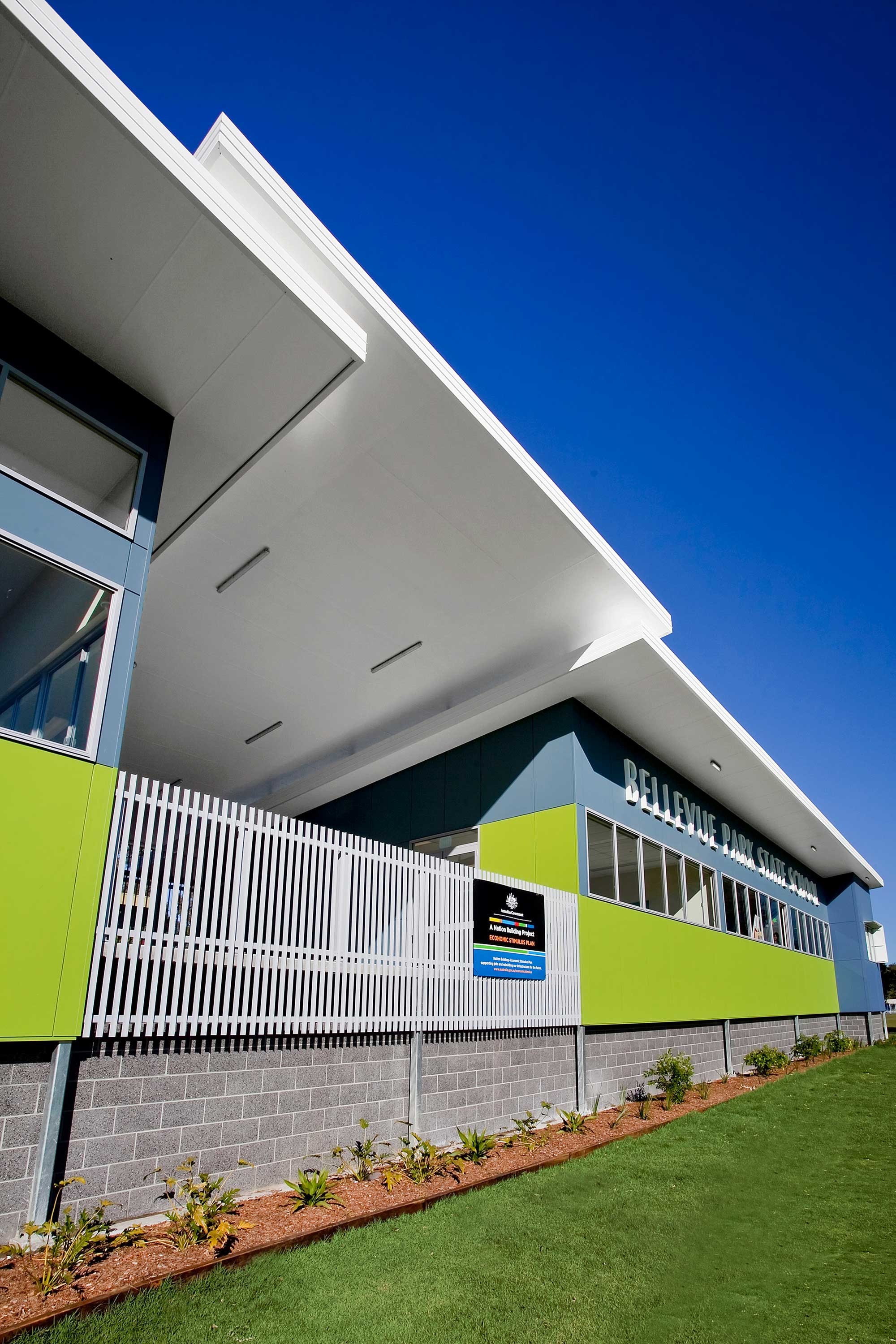 As part of the Building the Education Revolution (BER), Bellevue Park State School was awarded funding to facilitate the design and construction of a new purpose built ‘Education Building’ incorporating a number of new spaces to the existing school including, Resource Centre, Teaching spaces and Music Room. Unlike previous BER projects completed by JCA, working in close partnership with an ambitious school and a progressive Contractor in the National Buildplan Group, the practice was able to deliver a standout value for money building nominated as one of 14 leading examples in Queensland of the educational outcomes possible under the BER program. The project required extensive consultation to meet the schools’ desires whilst working within the limit of cost. The project brief was to deliver a bold addition to the schools existing infrastructure. The site for the new Education Centre overlooked the school oval, affording a good northerly aspect. This allowed the library space to maximise natural light and offer students views across the activated oval. Colour was a key element of the design. Encouraged by the School, this was used to give the building a contemporary presence on site whilst considering the pre-existing colour scheme. Internally colour was used to accentuate features and offer moments of joy for staff and students alike.