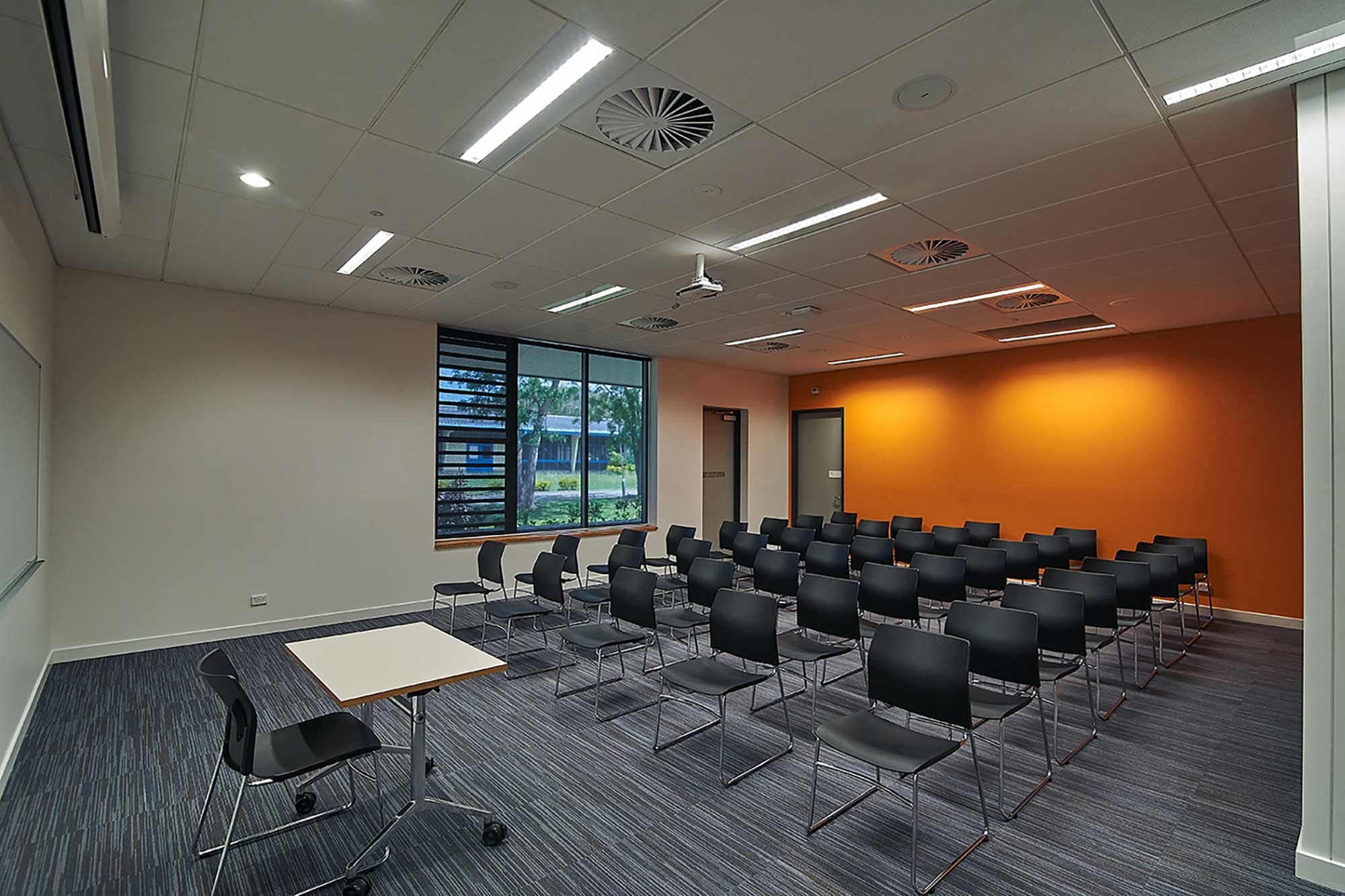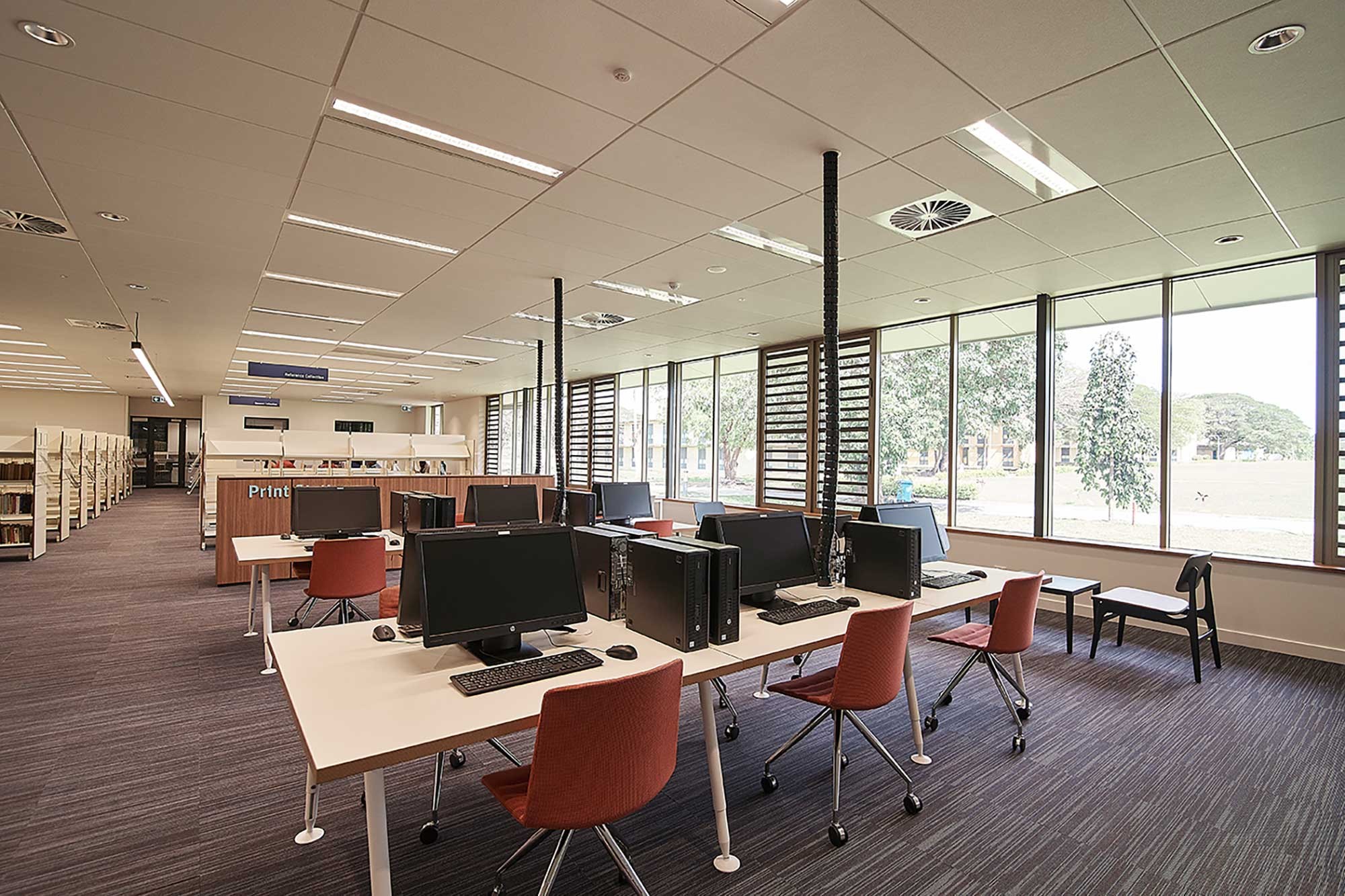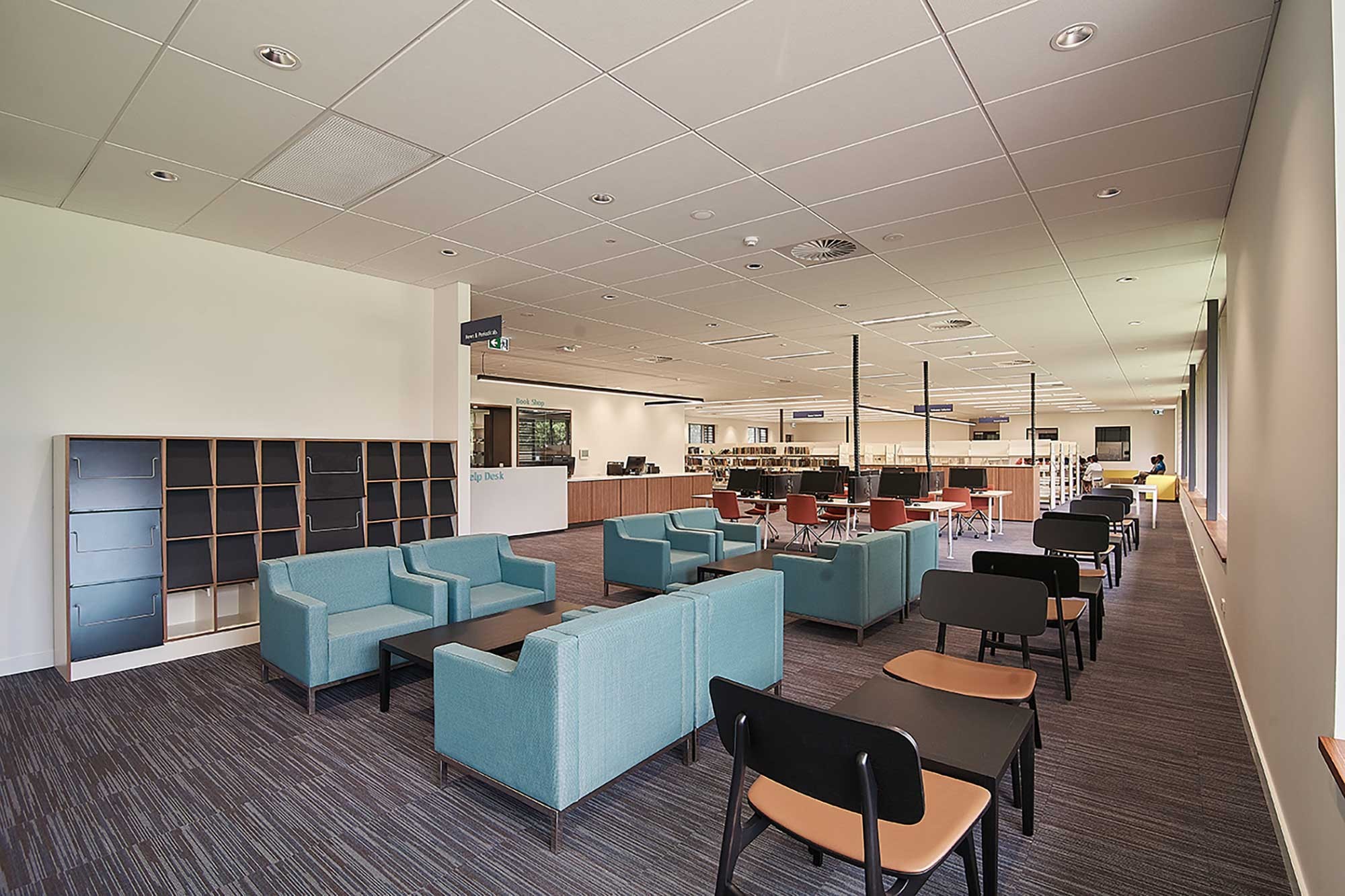 PILAG currently comprises a number of single storey blockwork constructed buildings. A form reflective of its 60’s origins. What the buildings have proven is the idea that the fundamental design principles adopted then offer a low cost, low maintenance highly successful solution. Adhering to these principles in a very contemporary way become essential in allowing the campus to retain its holistic and reserved aesthetic. Mosaic walls and internal screens have been treated as opportunities for integrated artwork as subtle layers of cultural significance. Breaking the mass and form and offering moments of colour and shadow. Both buildings are open plan environments with adjacent multipurpose meeting rooms to that facilitate a diverse set of group activities whether they are board room meetings, seminars, symposiums, lectures, tutorials or informal gatherings. The relationship between transparent open plan and enclosed meeting rooms is made dynamic through the use of timber screens and various forms of glazing motifs that create an environment where staff and students are empowered to choose the spatial quality that most suits their needs. The open plan spaces in both the new Administration Building and New Library are designed to be generous in scale, lively, mechanically ventilated but able to be naturally ventilated, naturally lit environments. They are designed so that the furniture and joinery within them create flexible and intimate work and learning environments.