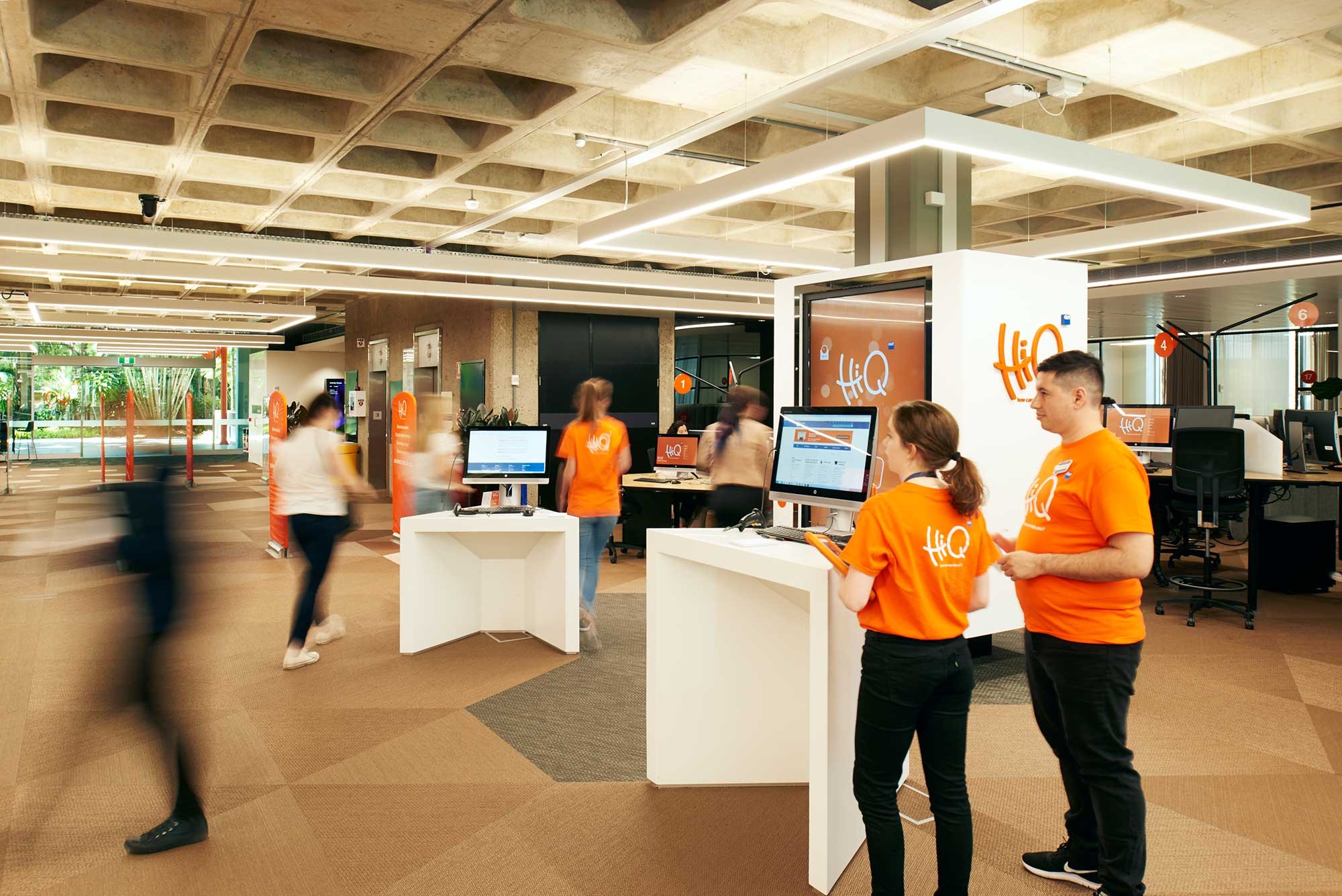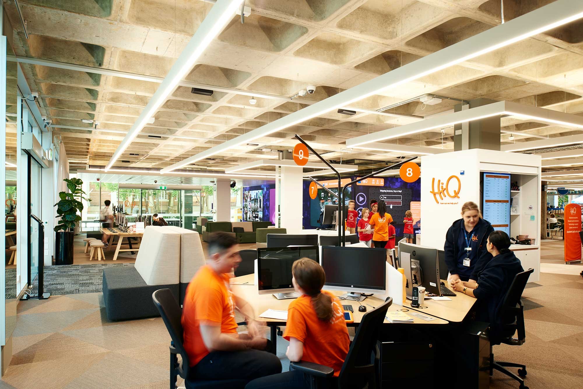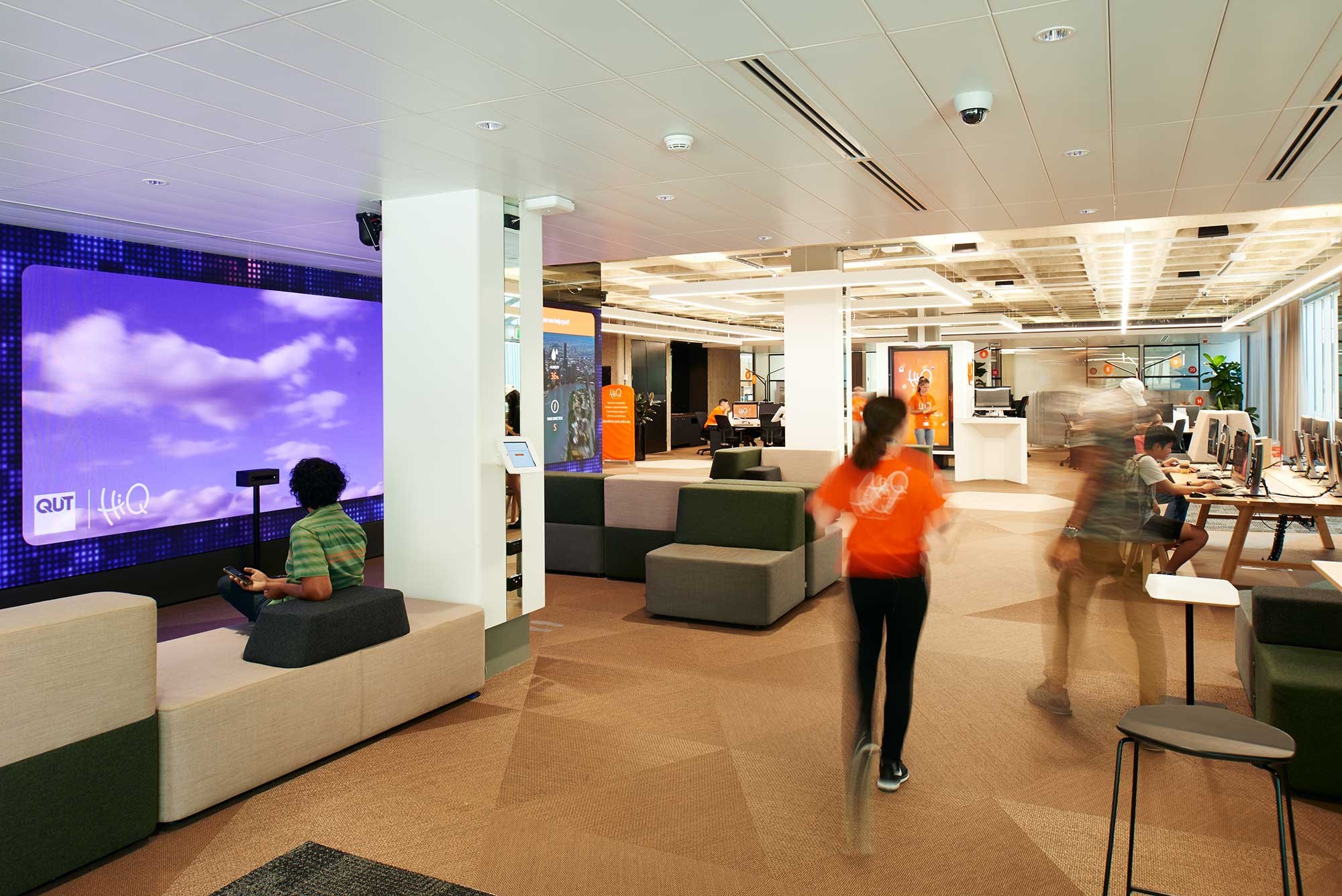The design is a response to student consultation clearly identifying friends and peers as a trusted and often first accessed information source and the deep commitment by the University to provide spaces that welcome and sustain ongoing occupation of the campus. Through the integration of large-scale technology installations the design enables users to engage with their peers, the support services available online and the dynamic support team freely moving in the space. Informally referred to as 'the Learning Party’ space by one post grad student, the HiQ has already developed its own identity on campus as a place where knowledge is to be gained, shared and maximised.
