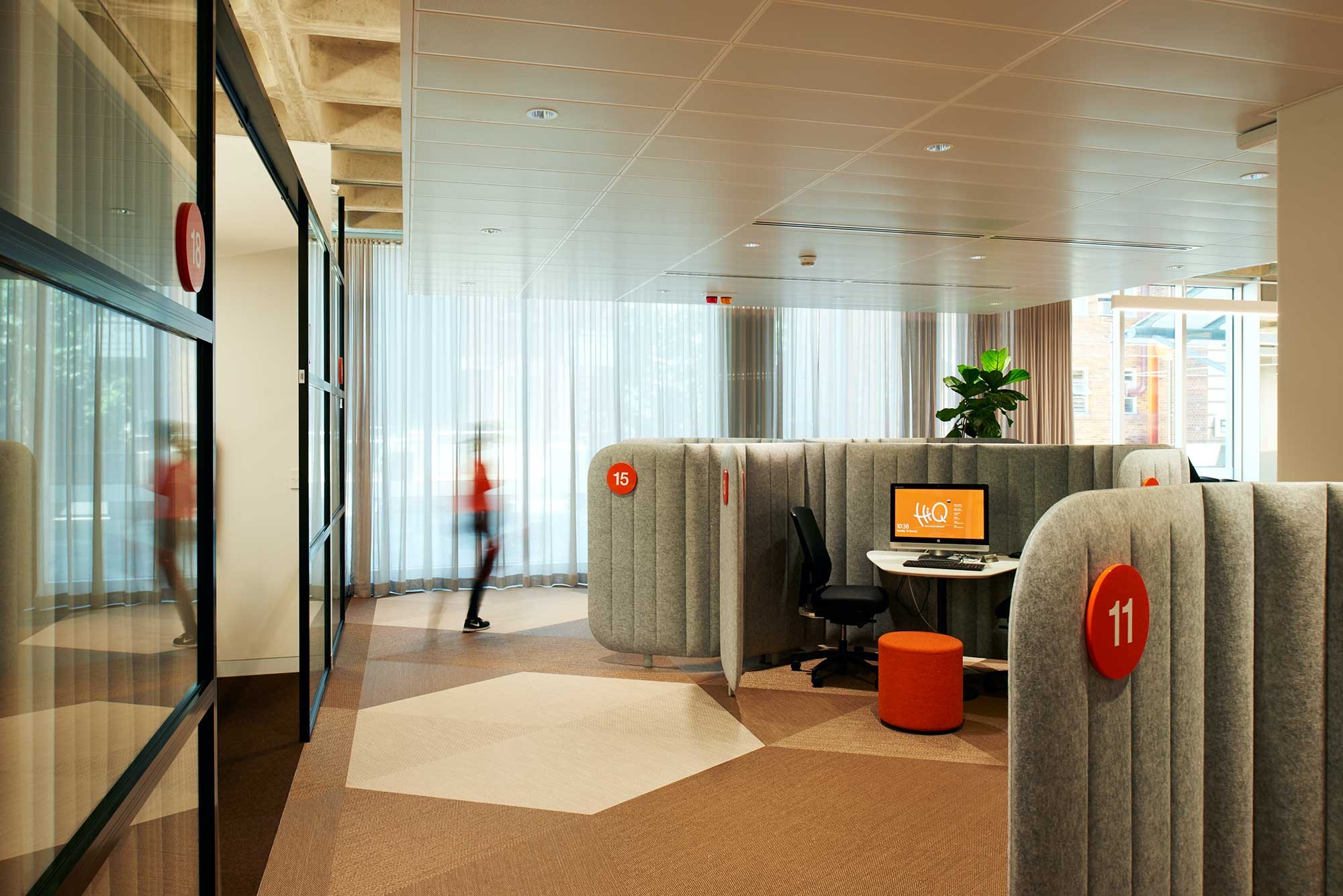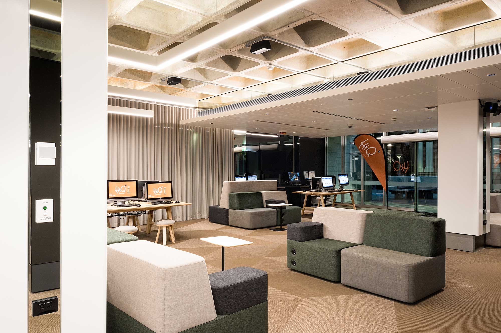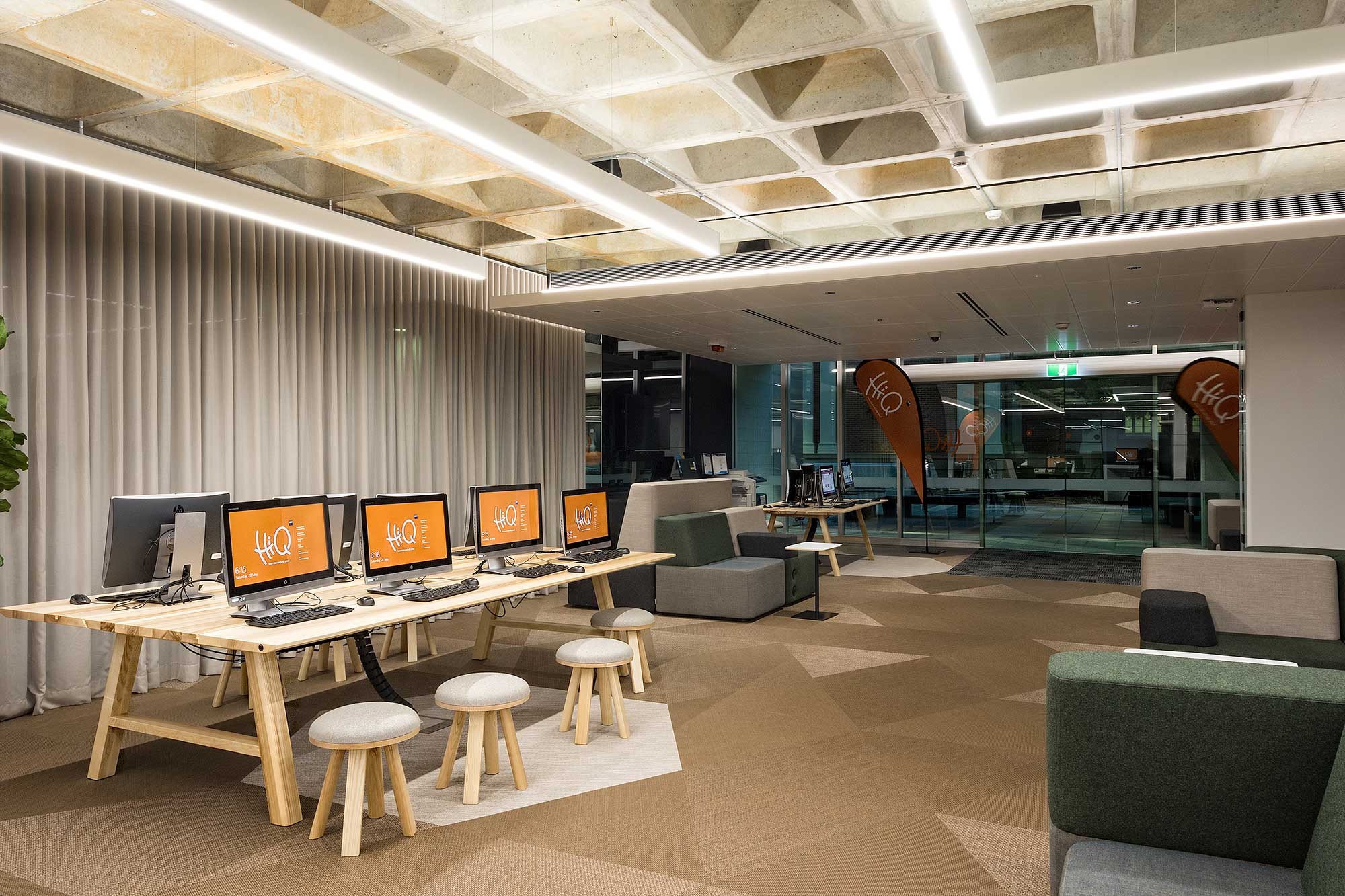 The design is a response to student consultation clearly identifying friends and peers as a trusted and often first accessed information source and the deep commitment by the University to provide spaces that welcome and sustain ongoing occupation of the campus. Through the integration of large-scale technology installations the design enables users to engage with their peers, the support services available online and the dynamic support team freely moving in the space. Informally referred to as 'the Learning Party’ space by one post grad student, the HiQ has already developed its own identity on campus as a place where knowledge is to be gained, shared and maximised.