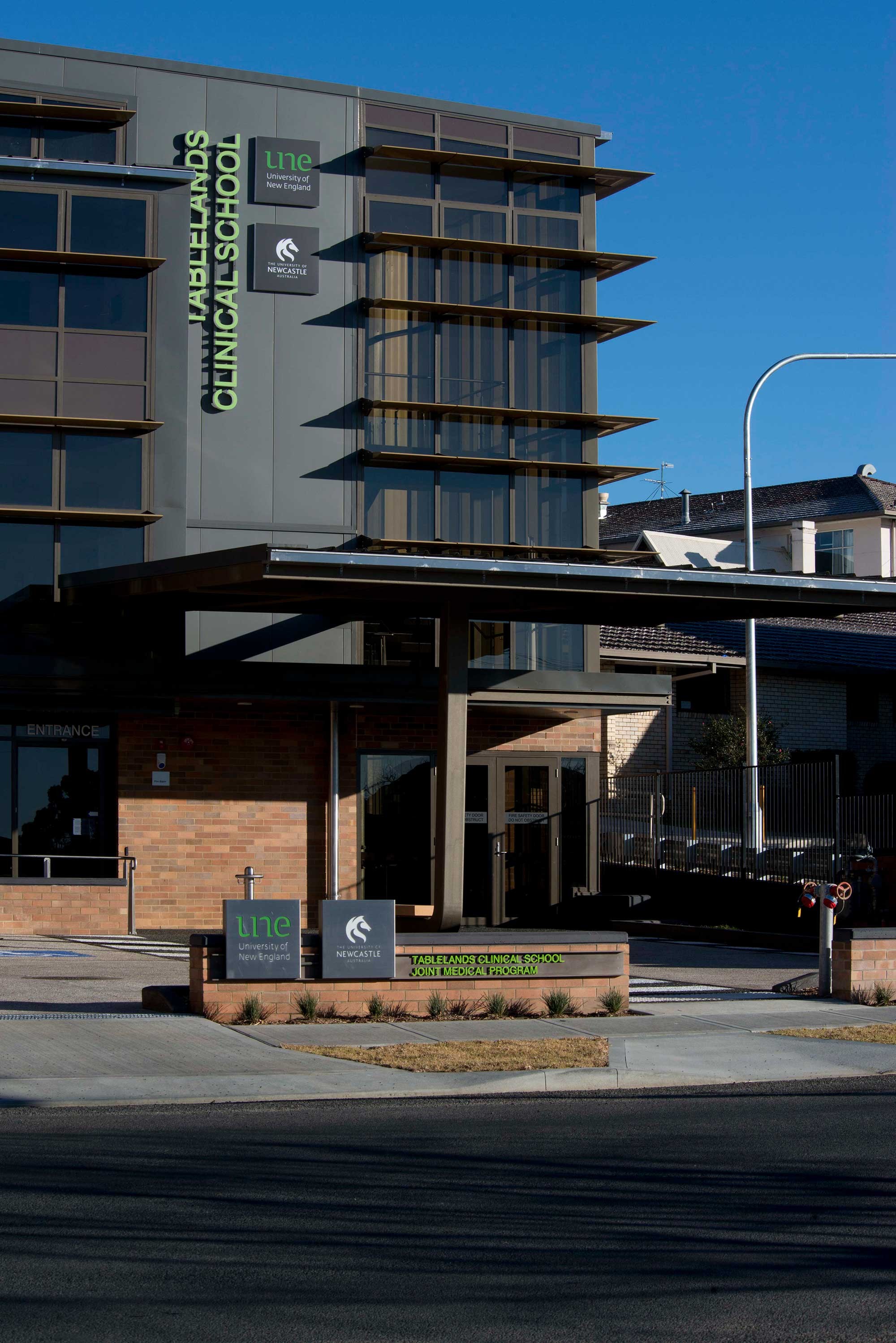 This unique facility was conceived to utilise the ability to enable medical students within the UNE to have direct and real access to Armidale Hospital and the associated health care facilities whilst being able to withdraw into dedicated learning environments effectively within the same ‘space’. The building proposes a state-of-the-art teaching GP practice on the ground floor with two upper floors that offer an academic base for students completing practical work within the Hospital. The Clinic will interface directly with the public providing 8 Consulting Rooms for visiting GP’s, 2 Treatments Rooms, Triage rooms, Procedure Rooms and all necessary ancillary rooms and spaces required.